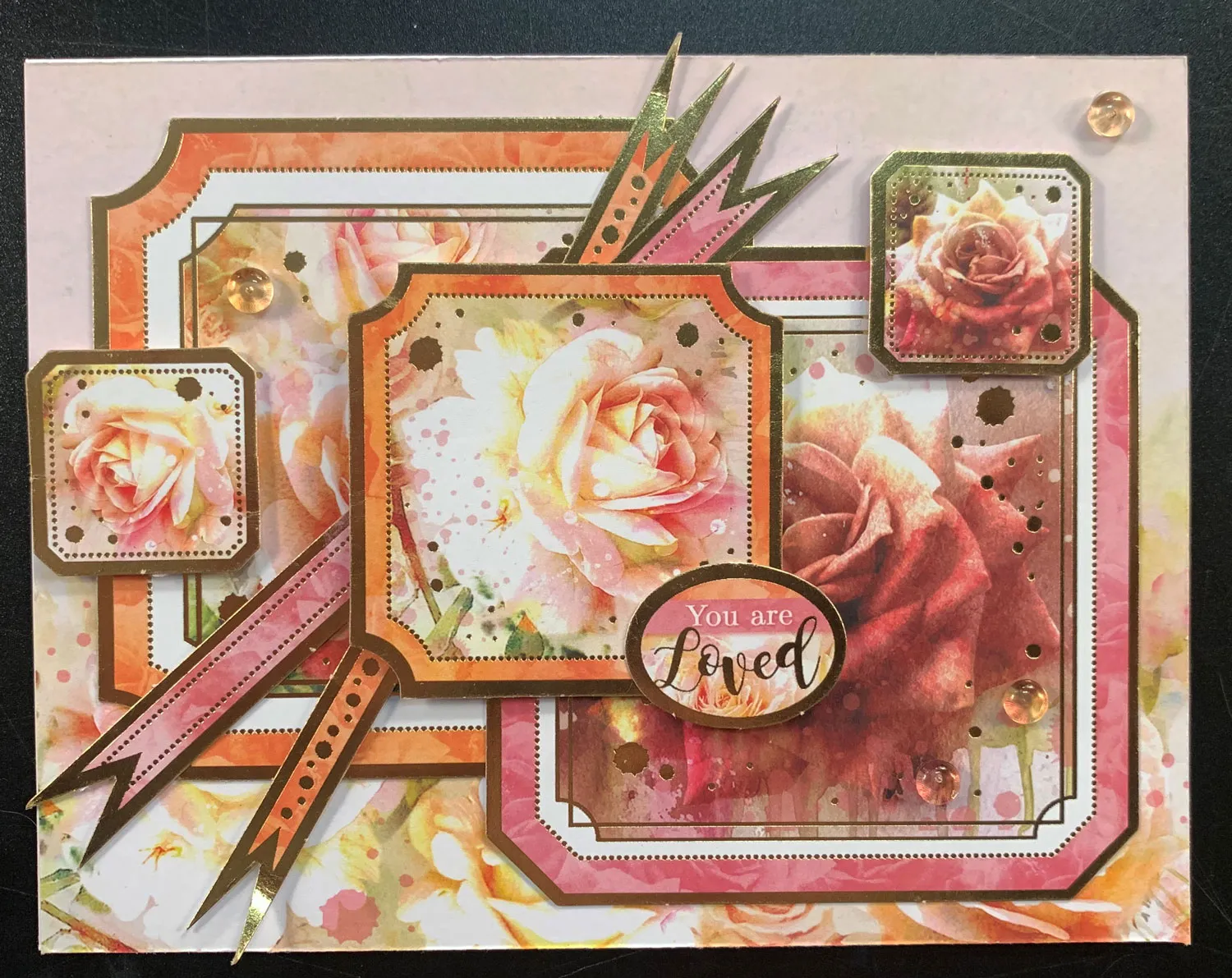 Glue the apricot roses Adorable Scorable to cover the card front. Create a collage using the corresponding die cuts. Glue the two large die-cuts ¼” from each corner. Trim the paper ribbons to cross them and glue in place. Foam tape the medium image over both large images. Foam tape a small image on either side of the collage. Glue the topper greeting to the center image. Glue the Shimmerz randomly to the card front with the Specialist Glue.