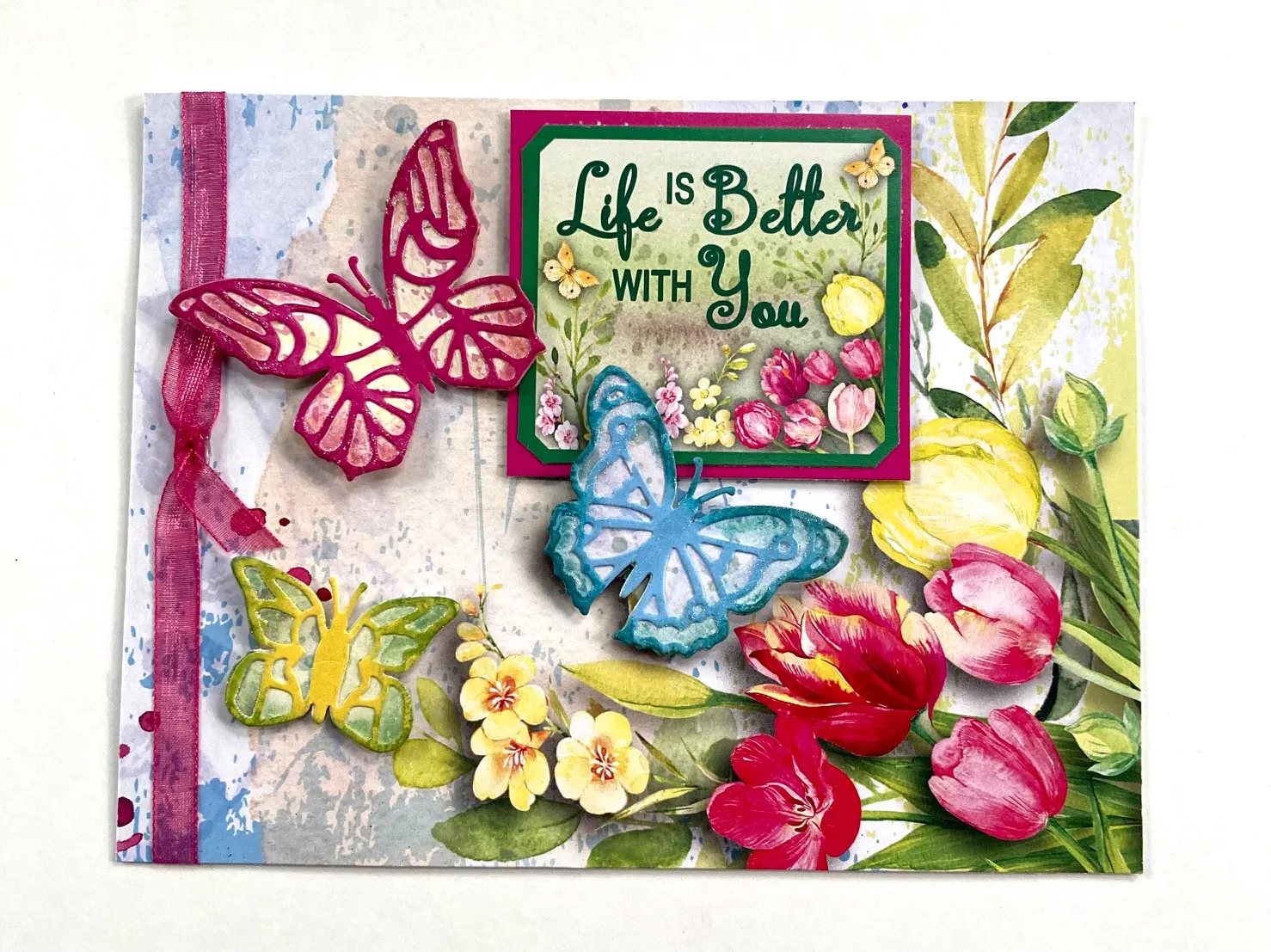 Debbie cut 6 ½”x5” Tulips & Butterflies 12”x12” Patterned Cardstock then wrapped a bow from Magenta/Dark Pink Ribbons Set around the left edge and glued it to her 6 ½”x5” card. She used the Butterflies Cutting dies on Patterned Cardstock and on Tulips & Butterflies 12”x12” Solid Cardstock. She inked the butterfly base and glued the solid butterfly on top. She foam taped them to the card. She matted a cutout from the Patterned Cardstock and foam taped it to the card nested under the butterflies. Tip: You can only attach the butterfly body to the solid piece to allow the wings to flutter. Striking when die cut from glitter cardstock or holographic papers!
