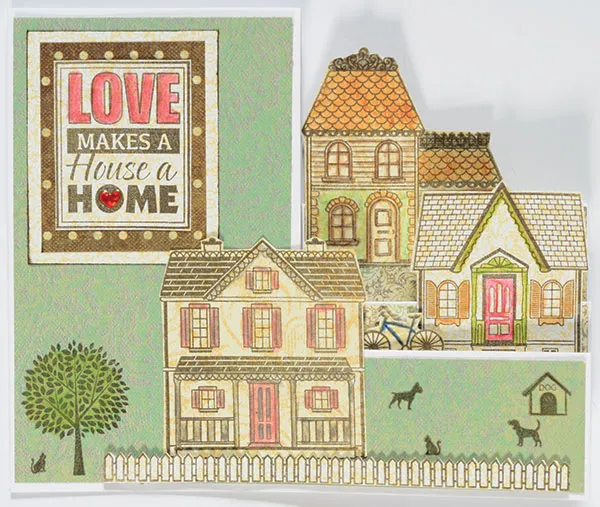 Stamp the three larger houses on Stolen Moments tan/cream paper and color with the watercolor pencils. Cut out and glue as shown. Stamp the fence on Stolen Moments tan/cream paper. Cut out and foam tape to the front, along the bottom of the house as shown.