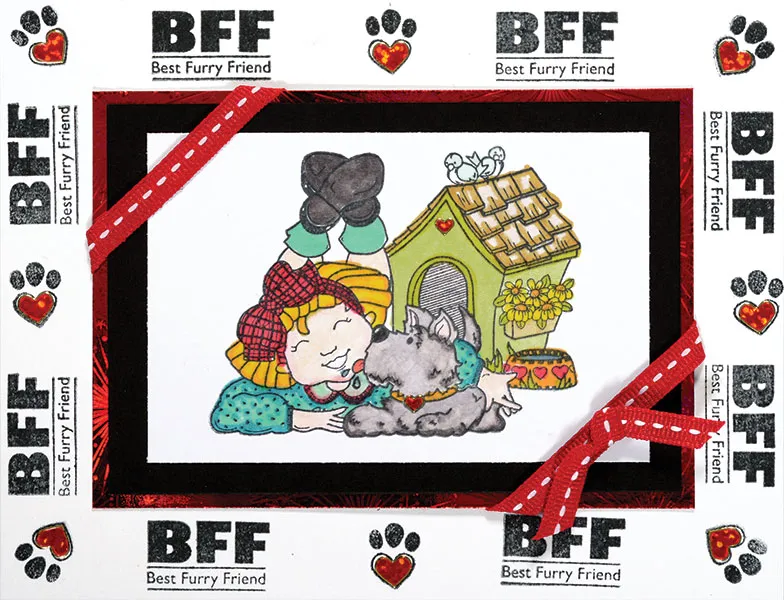 Stamp the girl, dog and doghouse image on 4 1/8”x2¾" white cardstock. Color with the Spectrum Noir™ pens as follows: hair, flowers, dog bowl and dog collar with GB5 and OR1; hair bow and hearts with GR8; grass and doghouse with CG2; dog and shoes with BG6, BG2, BG1 and IG4; sweater and socks with BT4, BT5 and BT1; skin with FS2, FS4 and TN2; doghouse roof with TN7 and GB8. Mat on black cardstock with 1/4” borders. Mat again on Red Fireworks holographic paper with 1/8” borders. Wrap a red stitched ribbon around the top left corner and bottom right corners, gluing the ends to the back. Glue to the card, centered. Zot™ a ribbon knot on the bottom right corner ribbon as shown. Add the heart Dazzles™ in the paws. Place the small heart Dazzles™ on the doghouse and dog collar.
