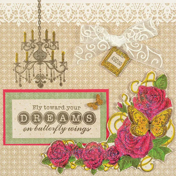 Stamp the chandelier so it's hanging from the top left, and color with gray and yellow. Stamp “Fly toward your...” on 2½"x1" tan dot paper, mat on Kindred Spirits green paper with 1/8" borders and then on pink cardstock with 1/16" borders. Glue 1/8" from the left, between the roses and the chandelier. Stamp the tiny butterfly and the postage stamp on tan dot paper. Color the postage stamp with yellow and brown, and the butterfly with yellow and orange, and cut out. Foam tape the tiny butterfly on the upper right of the greeting as shown. Tie a bow with sheer white swirl ribbon and Zot™ to the upper right. Foam tape the postage stamp beneath the bow as shown.