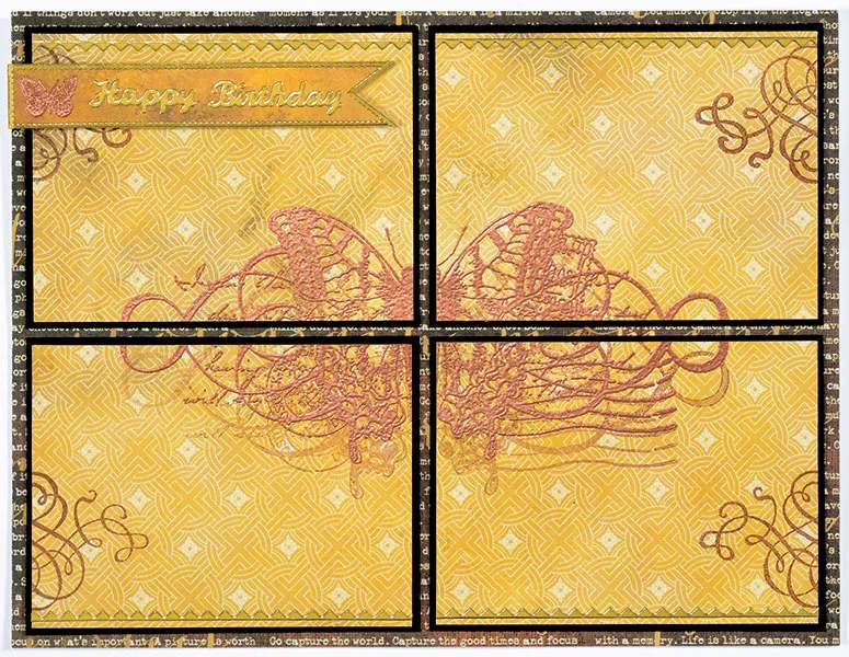TECHNIQUE: Shadowed Quad Panel Off-stamp the large butterfly/scroll image in brown, centered horizontally, 1” from the bottom of 6”x4½” yellow tile paper. Stamp the image again with VersaMark™ centered on the piece, dust with copper embossing powder, shake off excess and set with the heat gun. Stamp the scroll in brown off the right and left sides, at all four corners. Place Thin Lines Dazzles™ 1/16” from the top and bottom edges. Cut the piece in half vertically, then horizontally and mat each piece on black suede with 1/16” borders. Glue the pieces centered on your card front with 1/8” between edges.