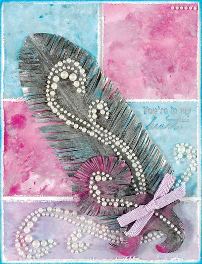 Zot™ the feather at an angle, as shown, and place a pearl swirl down the center. Zot™ the flourish as shown, place a small pearl swirl along the center. Place more pearl swirls around the base of the feather, as shown. Zot™ a small bow onto the flourish. Place a small row of pearls on the upper right corner.
