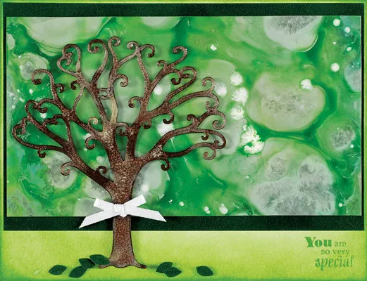 Follow your die cutting machine manufacturer’s instructions to cut a tree die-cut from clove brown cardstock. Lay the die-cut on your craft sheet and cover with a thick layer of Crackle paint. Let dry for a few hours until the finish is hard and crackled. Tie a length of 1/8” white grosgrain around the tree trunk and Zot™ in place, as shown.