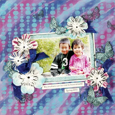 Mat 6”x4” photo with ivory cardstock, leaving 1/16” border and Robin’s Red aqua tapestry paper, leaving 1/2” border. Ink the edges and mat with white cardstock, leaving 1/8” border and ink the edges again. Glue to the page center as shown.