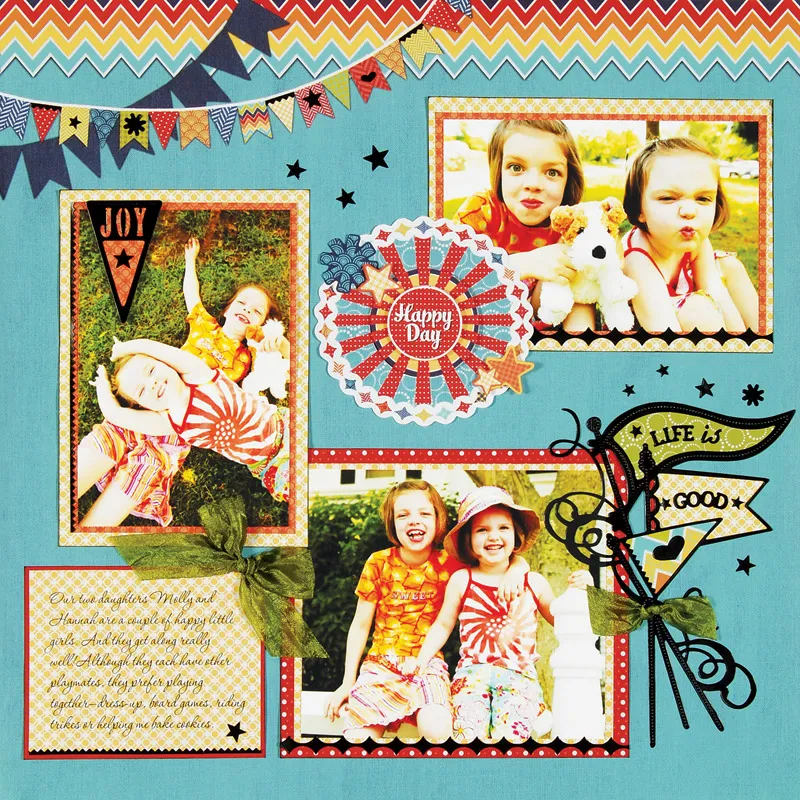 Write or computer print journaling on yellow dots paper and trim to a rectangle. Add a border sticker along the bottom edge, trimming evenly. Mat on red paper and ink the edges black. Glue to the lower left corner of the page as shown. Foam tape the “Happy Day” Papier Tole Die-Cuts embellishment together and glue near the center of the page, overlapping the lower left corner of the top photo.