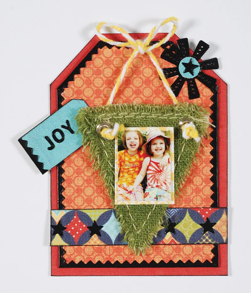 Instructions: Back a Dazzle sticker with 1 1/2" wide red crepe ribbon rather than paper for a shiny finish. Simply trim the edges evenly with the sticker. To back the tiny banner sticker with paper, cut 1 narrow strip from red textured paper and 1 from aqua textured paper. Use your scissors to cut each strip in angled pieces, alternating direction as you go. Add the pieces to the back of the sticker, trimming any excess as needed. Embellish matted photo with stickers and baker’s twine.