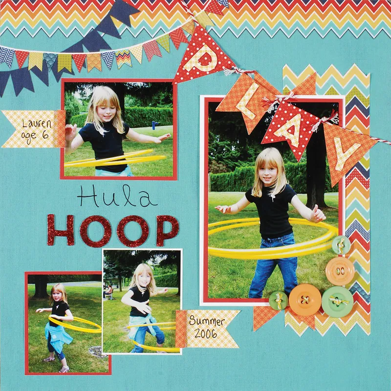Use the banner template to cut small banner shapes from red dot and orange circle paper. Glue to a length of red twine and tie lengths of twine between each banner piece. Glue the twine lengths across the top right corner. Use tape to secure the twine at the back of the page. Cover DIY letters with yellow circle paper. Place on the banner pieces.
