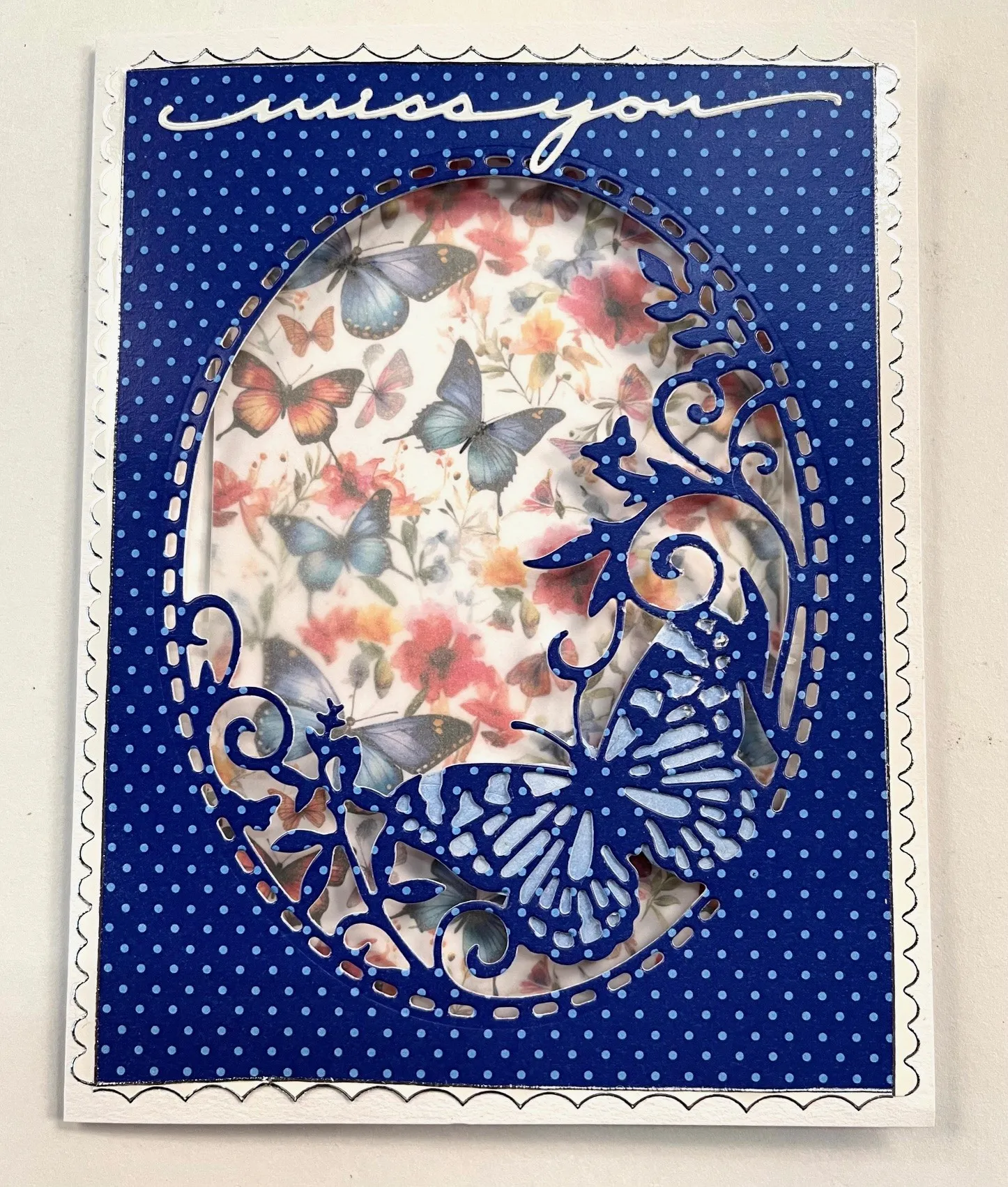 Cut 4 ½”x6” blue dot Butterfly Garden Cardstock and glue to the center of a card. Use low tack tape to secure the Butterfly Window die in the center of the card front and run it through your machine. Die cut he solid butterfly from white cardstock. Use the blender brush to apply the ink pad to the piece. Glue it behind the butterfly in the window.