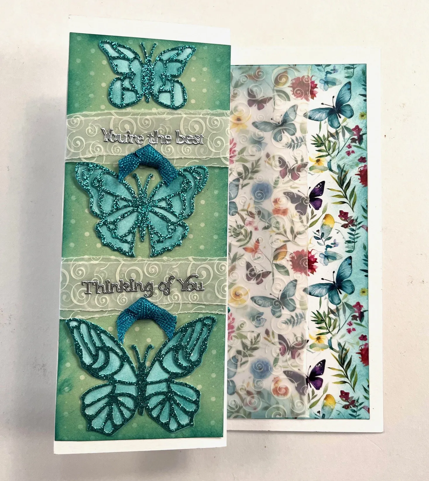 Inside: Cut 4 ½”x6” teal Butterfly Garden Cardstock. Shade the edges with Teal ink pad and a Blender Brush. Glue inside the card being sure the paper edges at the same as the dot paper on the card front. Tear 3”x6” Swirl Vellum and apply dots of Glue Stick over the art in the Butterfly paper. Place the Vellum on top. Use the Butterfly Cutting Dies on Teal Glitter paper and glue them as shown so they don’t show when the card is closed.