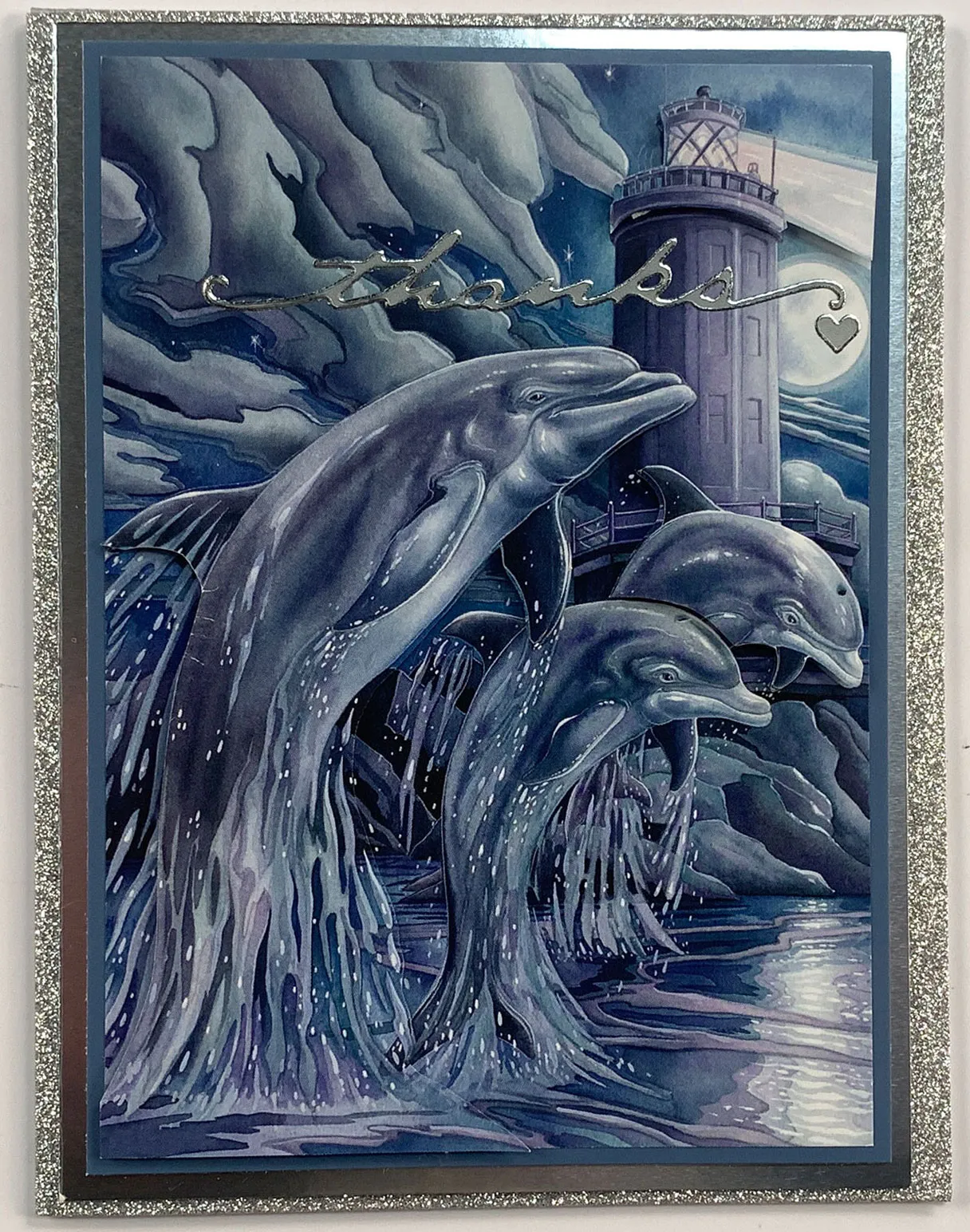 Select the dolphins page from The Little Book of Animal Kingdom Second Season and mat on blue Adorable Scorable leaving a 1/16" blue border. Mat again on silver cardstock leaving a 1/8" silver border. Foam tape to the glitter card. From another sheet of the same image, trim out the largest and smallest dolphin then foam tape over original images. Trim out the top of the lighthouse and light then foam tape over the original art. Place the "thanks" Dazzles™️ as shown.