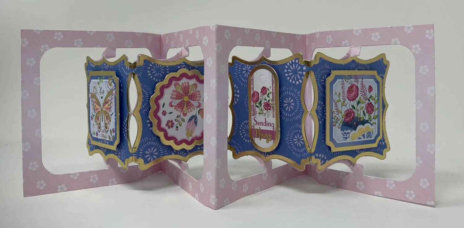 Mat 6”x4 1/2” large dot teal Dotted Duos #2 paper on teal Matt-tastic Adorable Scorable leaving a 1/8” white border. Glue to the card leaving a white border. Open the card and place the 3 1/8” and 1 ¾” circle dies as shown securing them with Low Tack tape. Run through the die cutting machine.