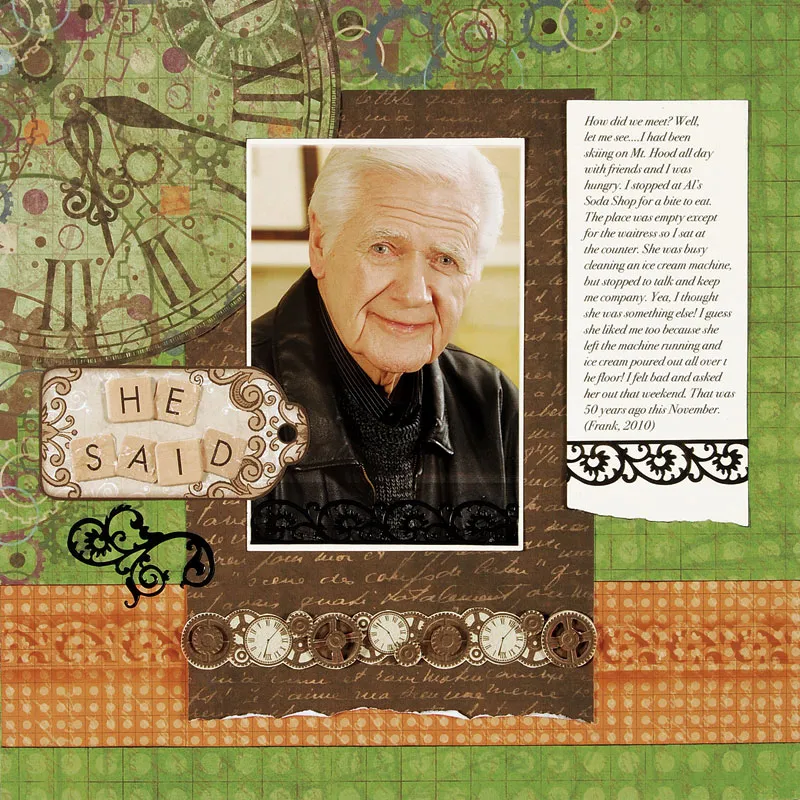 Background: For the left page: Place the green clock paper with the clock in the upper left corner. Use the craft knife to cut around the center of the large clock edge. Ink the long edges of a 12”x 2 ½” strip of golden dot paper and glue 1” from the bottom of the green paper. Tear the bottom edge of the 6” x 9” black script paper and glue the left corner under the cut away clock, 1 ½” from the page top and 2 ¾” from the left. Layer the clock tole border and glue at the bottom of the mat.