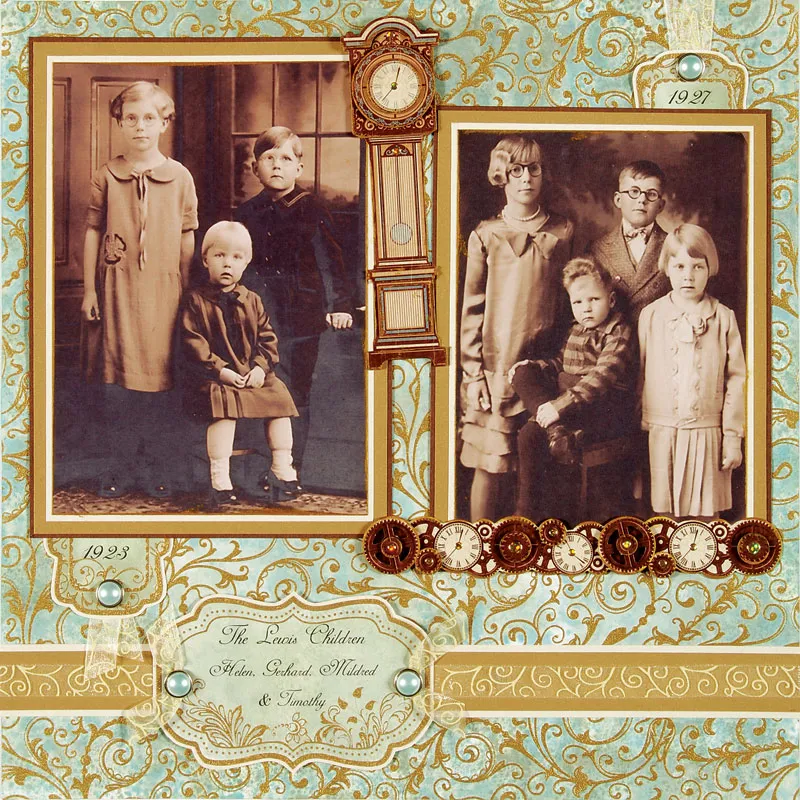 Cut a 2" ribbon, fold in half, then gently lift up one end of a small label and insert the fold under it. Repeat on the other small tag end, then insert a brad in each as shown. Punch out the die cuts for the grandfather clock and the border. Ink all the edges gold and let dry. Follow the instructions for assembling both pieces with foam squares between layers. Glue to the page and place Dazzles™ on them as shown.