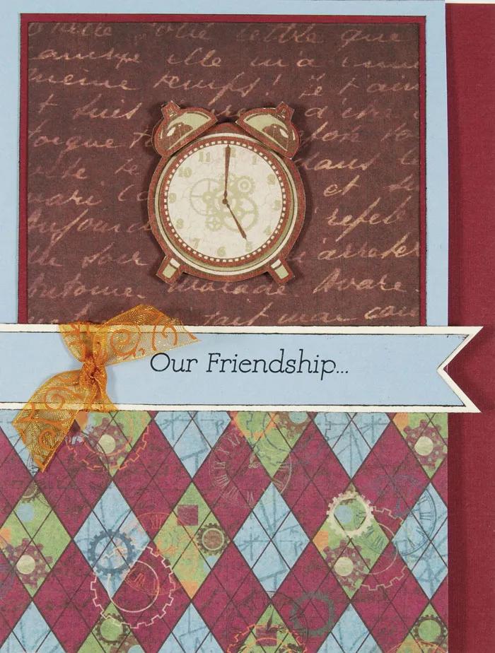Place the card fold at the side. Cut ½” from the right front edge. Cover the top ½ of the card front with light blue cardstock and center a matted 4” square of script paper. Cover the remaining portion of the card with diamond clock paper.