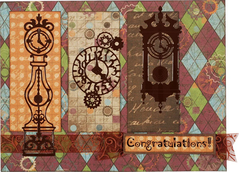 For the inside: Cut a 5½"x3½" Fun argyle paper, ink the edges, and glue centered on the inside. Cut a 1¾"x5" tan gears paper, ink the edges, and mat the long edges on cardstock with 1/16" borders. Glue as shown. Cut a 3 3/8"x1 7/8" Fun orange grid paper, ink the edges and mat on cardstock with 1/16" borders. Glue centered on the first pieces, then place the Dazzles™ sentiment, clock, gears, and clock hands as shown.