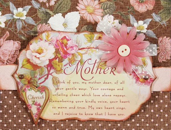 Inside the card: Glue a 2” strip of brown dot paper along the bottom inside back. Glue a length of white lace along the top edge. Glue a pink button to the lace. Stamp a bouquet of flowers and “I love you Mother” on a pink tag. Glue to the top left and secure a brown brad.