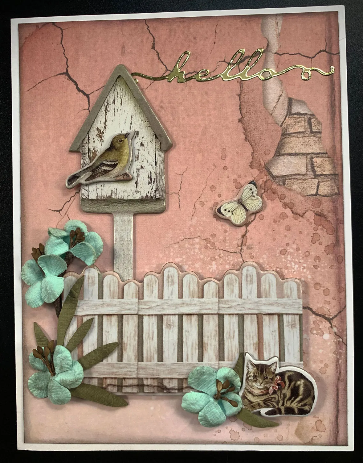 Glue a House of Roses cat die-cut to the fence at the lower right, a 1¼" bird to the birdhouse front, and a ¾" butterfly to the wall as shown. Cut a stem of small flowers to 2½" tall and lightly ink the blossoms. Glue the stem along the left end of the fence.