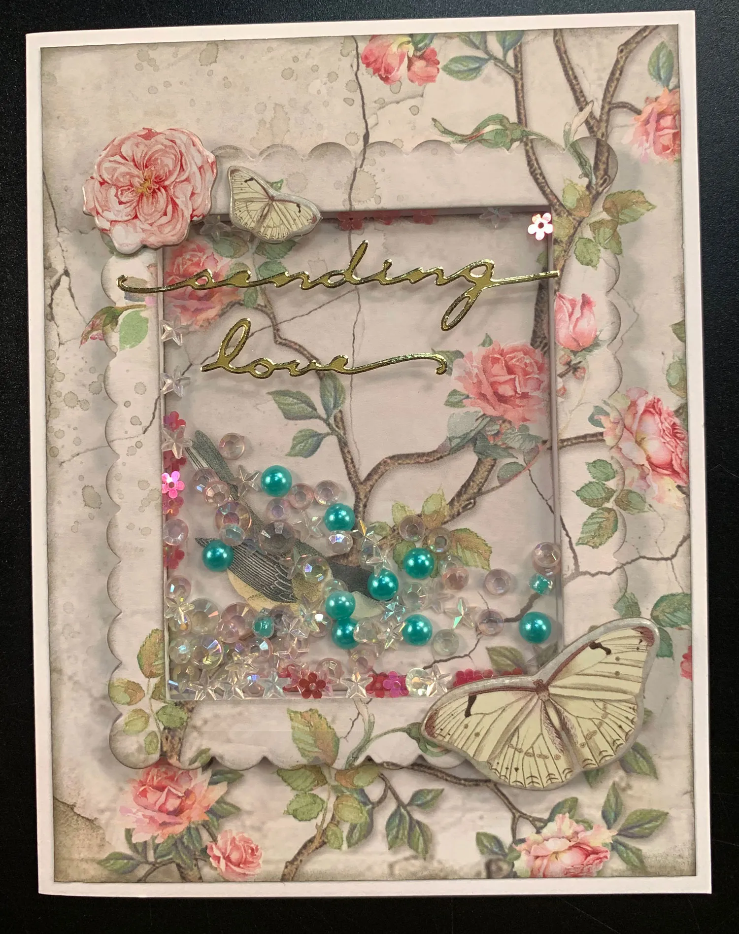 Place gold “sending love” Dazzles™ on the acetate window as shown. Use the Extra Sticky tape to adhere the large butterfly die-cut over the lower right frame corner and a 1" pink rose and small butterfly die-cut at the upper left.