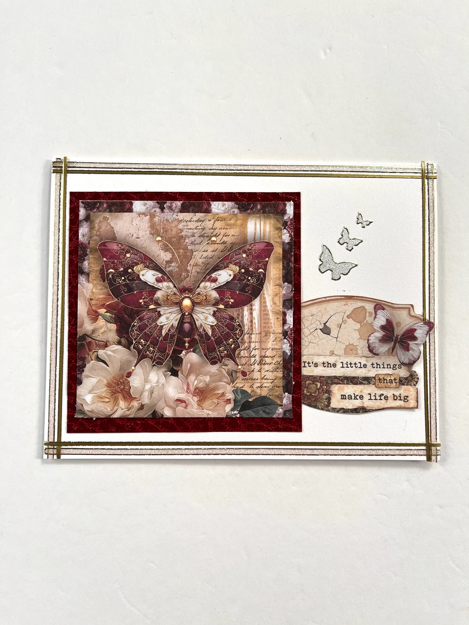 Cut out “It’s the little things. . .” especially around the right edge as shown. Place on the craft mat and use a blender brush with velvet fawn ink pad to color the edges. Glue it as shown tucked behind the matted butterfly. Place silver butterfly Dazzles™ as shown.