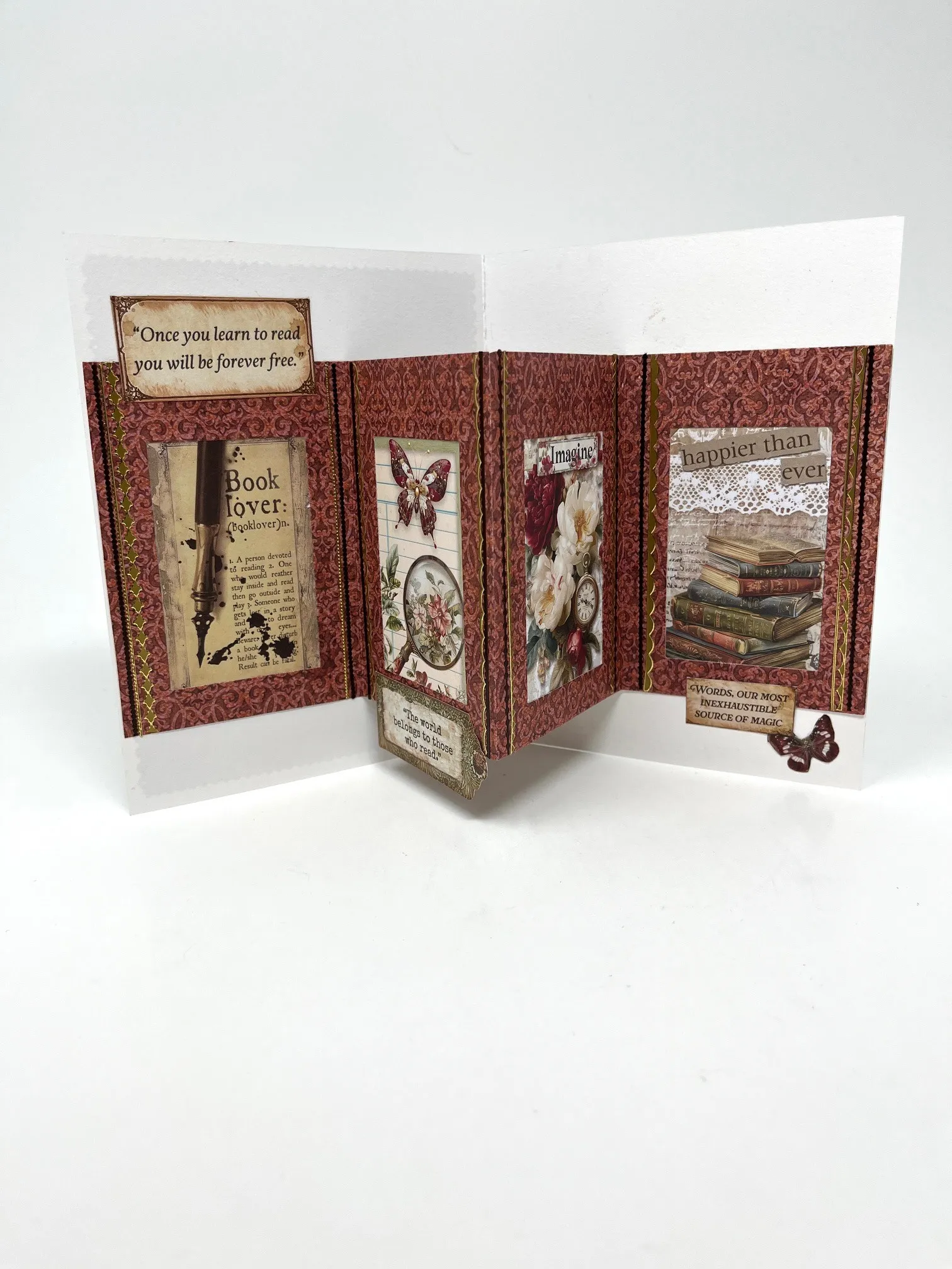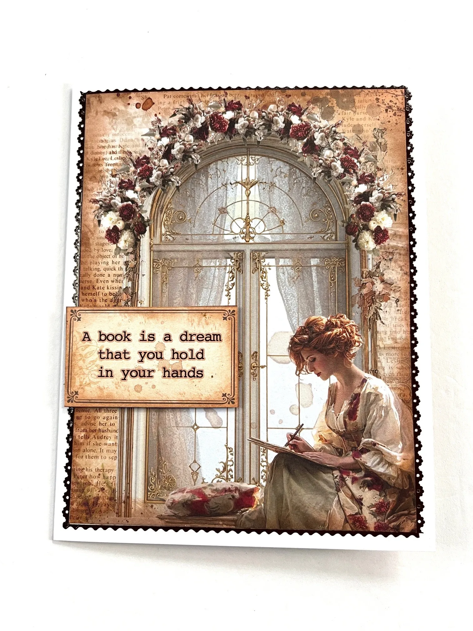 Place the card with the fold on your left. Cut out 4 ½”x6” arch with lady. Place on the craft mat and use a blender brush to apply velvet fawn ink to the edges. Glue to the card front. Place brown thin line Dazzles™ around the paper. Cut out “A book is a dream. . .” and color the edges with velvet fawn. Foam tape on the left as shown.