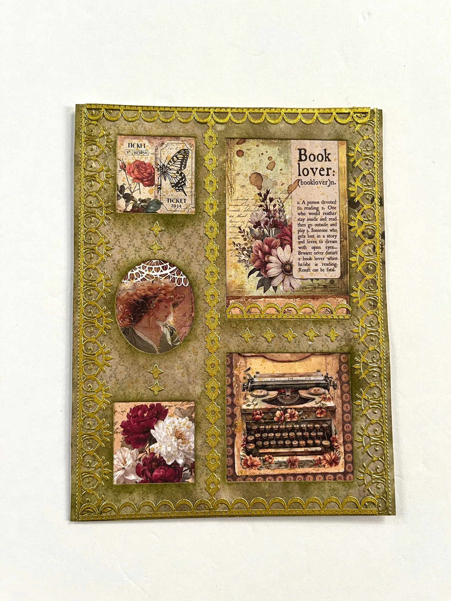 Cut out the images shown but cutting them a bit larger than the windows. Glue each behind a window. Glue the 5”x6 ½” piece to the card front. Place gold pearl fancy border Dazzles™ along the outside edges and along the center and below the “Book lover” piece. Add diamonds from the Dazzles™ sheet as shown.