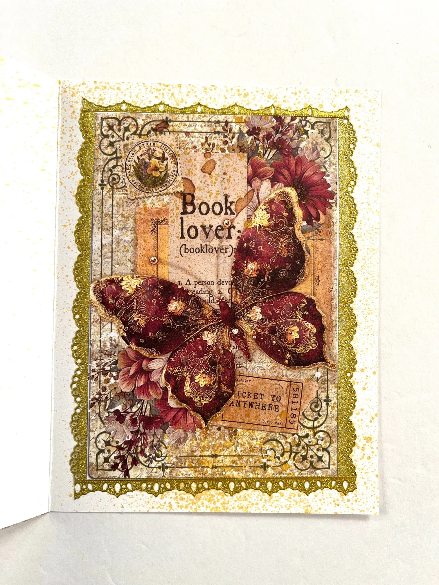 Inside: Cut out the large Book lover image and glue inside the card. Cut the widest gold pearl border in half and place each along the longer edges. Place other gold border Dazzles™ at the top and bottom. Repeat to spray with gold mist.