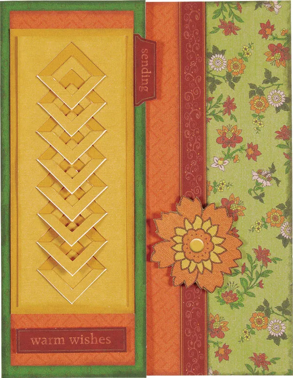 Inside the card: Glue the blue strip with the pink mat 1 1/2” below the fold. Trim excess on the sides. Glue the sympathy greeting to the right, centering top to bottom, as shown.