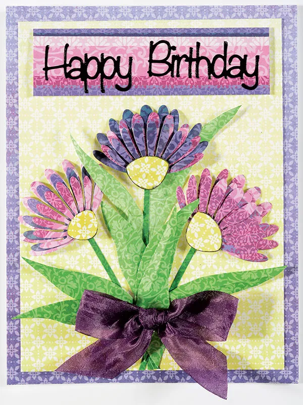 Use Zots™ to layer 3-4 flower petals, starting with the largest on the bottom and ending with the smallest on top. Zot™ a flower center on top. Assemble three flowers and arrange as shown. To attach them to the card, use a double layer of foam tape under the flower centers (so they keep their shape). Glue the stems in place. Glue several leaves in place. Zot™ a purple crepe bow at the bottom where all of the stems meet.