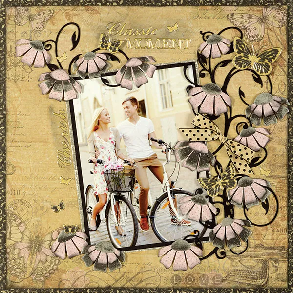 Place On Butterfly Wings Scrapbooking Dazzles™ tiny butterflies, “Classic Moment” and “Cherish” on the left and above the photo as shown. Place large, medium and small butterfly Dazzles™ onto On Butterfly Wings black dot paper and trim next to the Dazzles™ edge. Foam tape among the flowers as shown. Use a length of ivory/black dot ribbon to make a bow and Zot™ among the viney swirls on the right as shown.