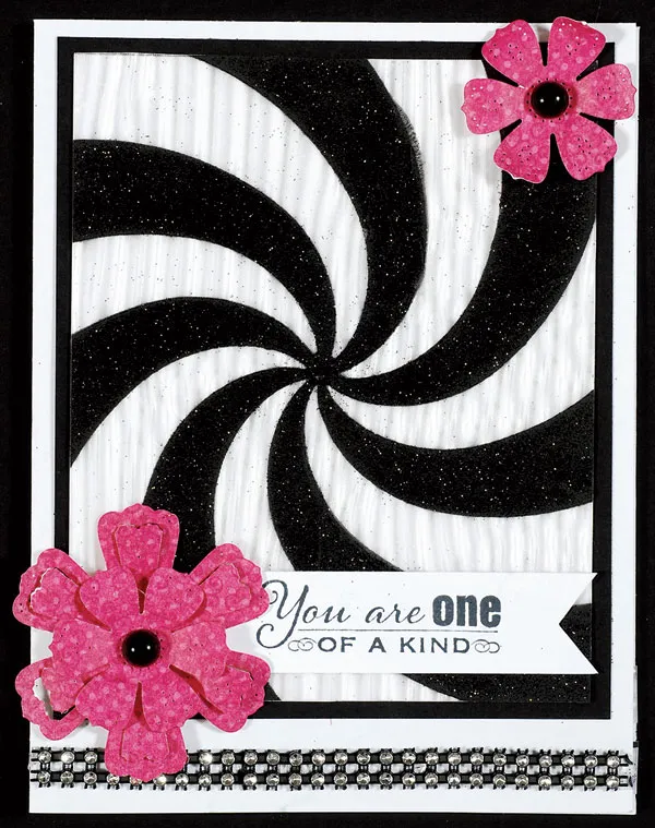 Card Front: Center Pinwheel template on top of Vertigo sheet and secure with stencil tape. Spread Black Embossing Paste with the Mini Squeegee using light handed strokes. Remove the tape and peel off the stencil slowly. Sprinkle with black glitter and set aside to dry completely. Place the 5”x6½” blank card with the fold on the left. Glue 4½”x5½” black cardstock centered and 1/8” from the top. Cut embossed Vertigo sheet to 4¼”x5¼. Save the left over pieces for later use. Zot™ embossed Vertigo centered onto the black cardstock. Glue a 5” strip of Black Bling on a Roll ¼” from the bottom.