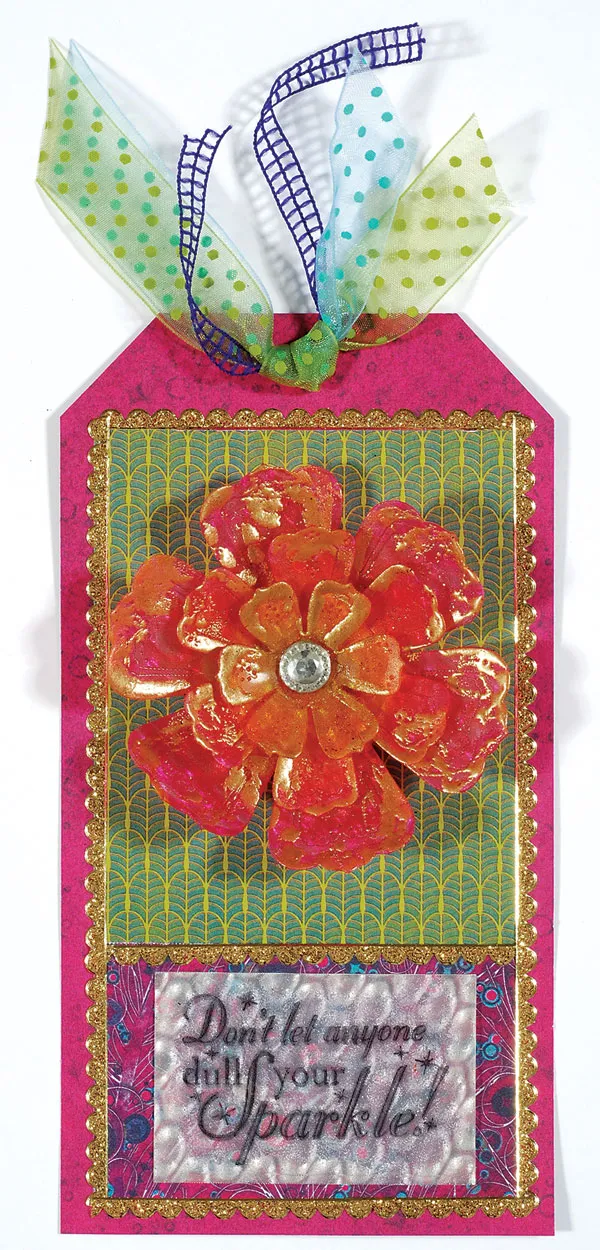 Flower: Using the Bodacious Blooms cutting die cut a 3¼” flower, a 2¼” flower, and a 1½” flower from the Vertigo Prism sheet. Color the large flower with BP7, the medium flower with FL2, and the small flower edges with FL2 and the center with GB6. Working on one flower at a time, use the VersaMark™ ink refill like a pen to draw around edges of the flower. (You can do this neat or messy depending on the look you are going for.) Sprinkle with Gold Embossing Powder, shake off the excess and heat set. Repeat the process with the remaining flowers. Glue the flowers together with Crystal Lacquer and let dry completely. Place a Pave Crystal in the center of the flower. (If you do not wish to create a broach you can Zot™ your flower to the tag now.)
