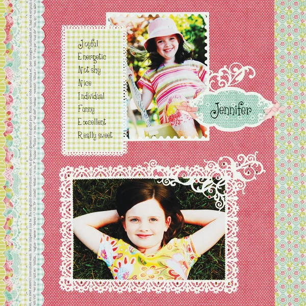 Journal on 2 1/2”x3 1/2” of green gingham paper and glue 2 1/2” from the right and 2 3/4” from the top. Place pieces of the large lace border along the top and bottom and the small scallop border along the sides. Print a caption on 2 3/4”x2” of aqua pattern. Place the fancy swirl label onto the caption and trim any excess paper. Glue to page 3/4” from the top and 2 3/4” from the right. Journal onto 3”x1 1/2” of aqua pattern and place the other swirl label centered onto it. Trim any excess paper and glue to the page 1” from the bottom and 2” from the left. Zot™ a pink crepe bow to the left of the caption as shown. Add pink Jewel Dazzles™ as desired.