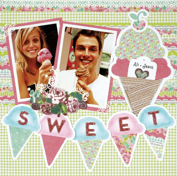 Ice Cream Cone Banner: Trace five cone shapes from various patterned papers. Cut five cones from white cardstock and chalk every other blue or pink. Glue to top of cones, mat the cones with white cardstock, leaving a 1/8” wide border. Glue them across the bottom of the page as shown.
