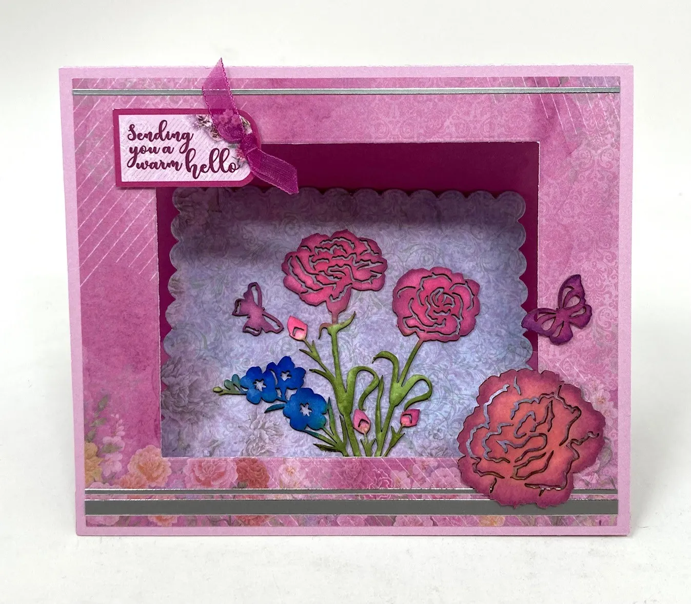 5. Glue the large carnation blossom and a butterfly to the front at the lower right as shown. Foam tape the “sending you a warm hello” cutout at the upper left. Knot 3" of sheer magenta ribbon and glue it to the greeting as shown.