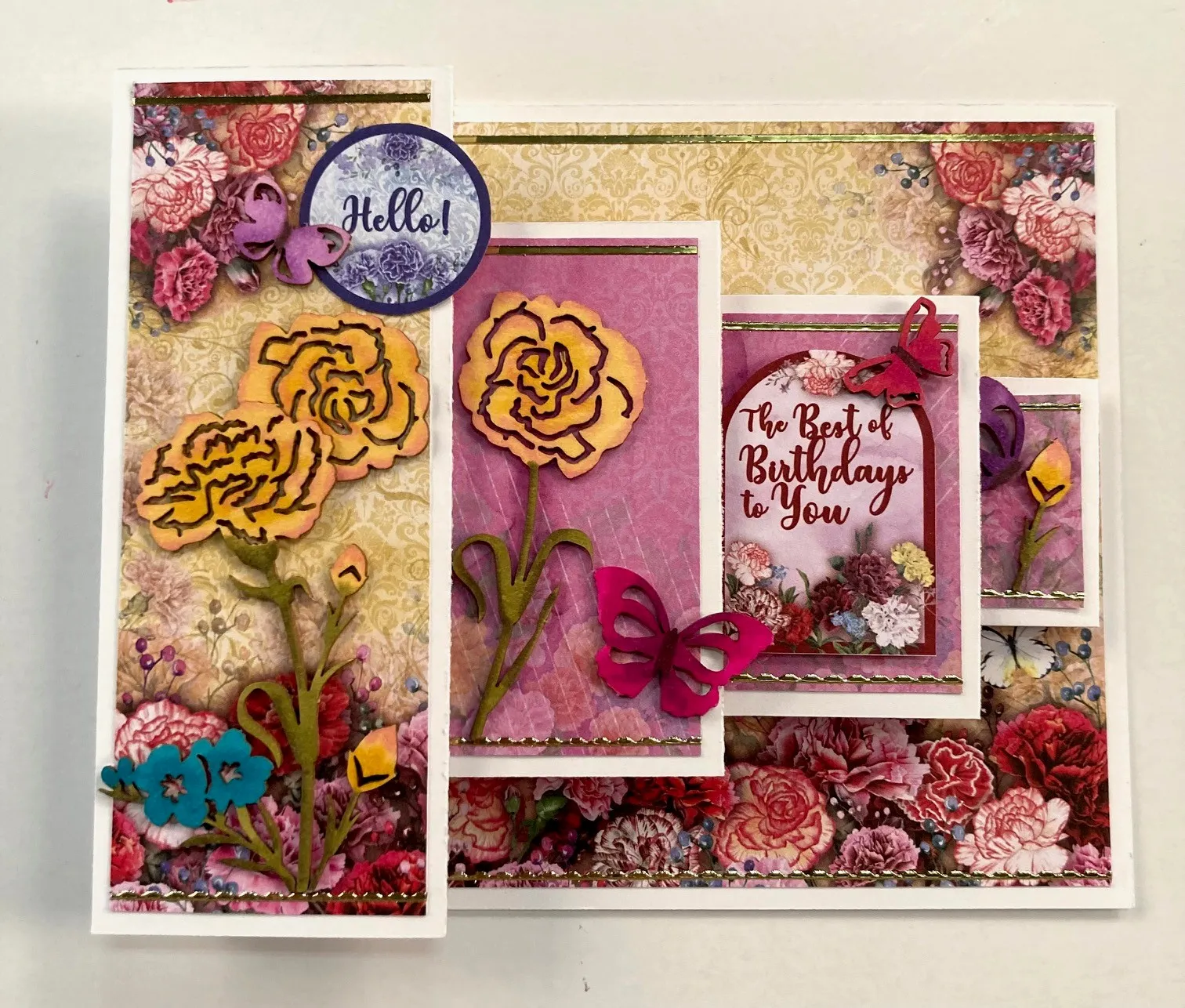 7. Use the tri-blend markers to color the chipboard pieces shown, blending the colors for depth. Glue the “hello” cutout to the upper front as shown. Glue five chipboard pieces to the panel as shown. Glue a stemmed carnation and butterfly to the second tier. Foam tape the “best of birthdays” and a small butterfly to the third tier as shown. Glue a bud and a butterfly to the fourth tier.