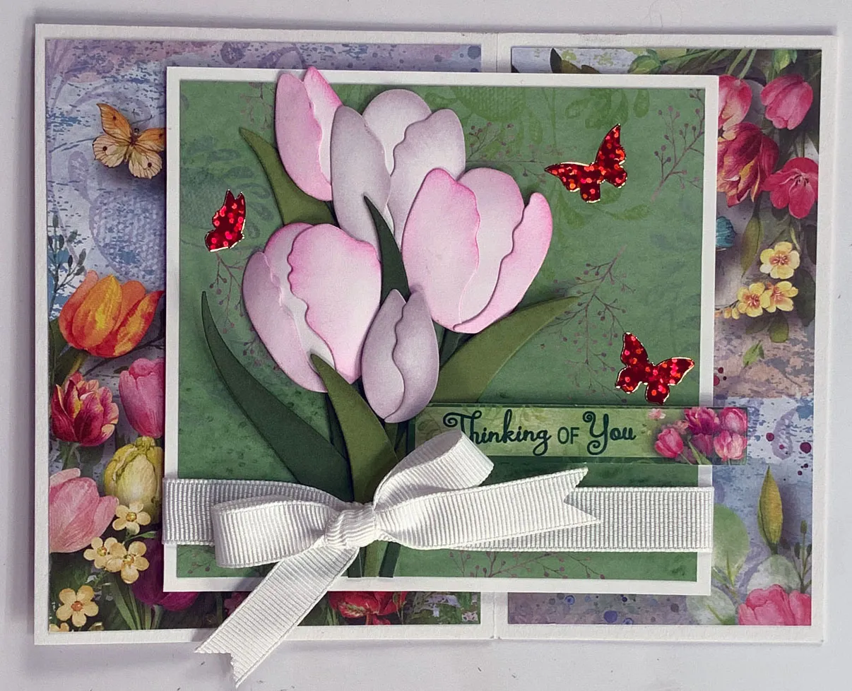 4. Make a shoestring bow with the same ribbon and glue it over the first ribbon and the stems. Foam tape the Tulips & Butterflies “thinking of you” banner die-cut and place jewel butterflies on the panel as shown.