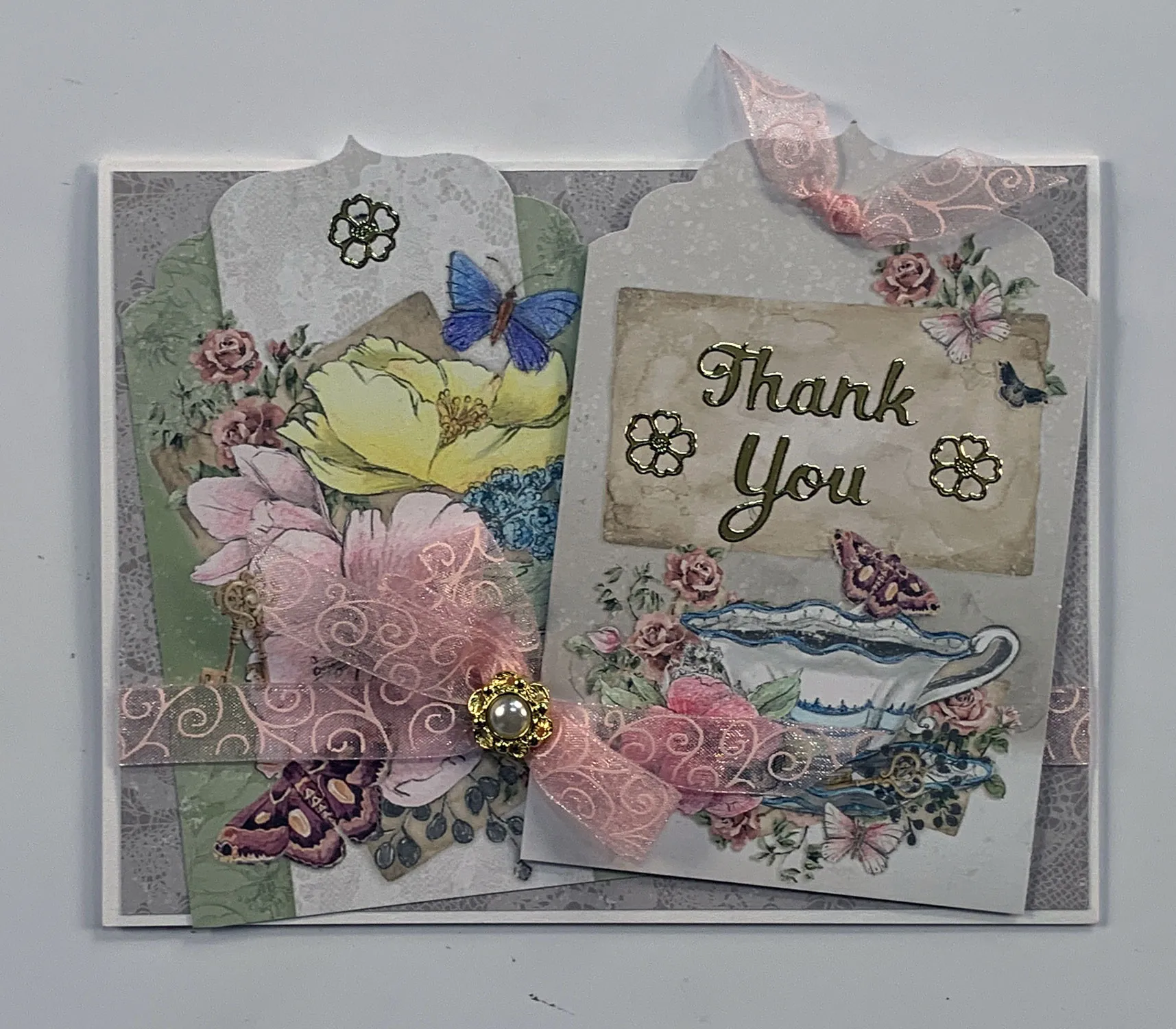 Cut 6 3/8"x4 7/8" Everlasting Memories tan lace paper. Glue the floral tag on the left end, angled as shown. Wrap a 7" length of pink swirl sheer ribbon across the paper, 1" from the bottom, and secure the ends to the back. Glue the paper centered on the card front.
