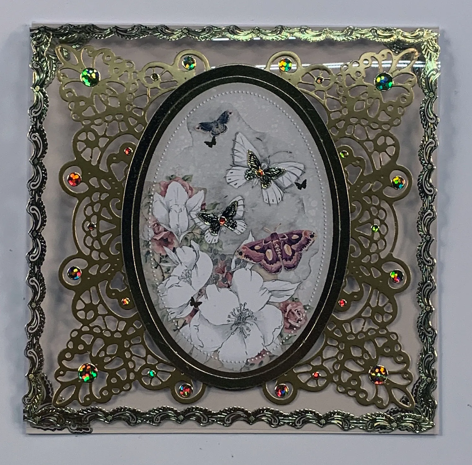 Remove the Everlasting Memories oval butterfly/flower topper and narrow gold frame together from the backing. Glue both to the gold die cut center. Place jewel Dazzles™ and small gold butterfly stickers on the front as shown.