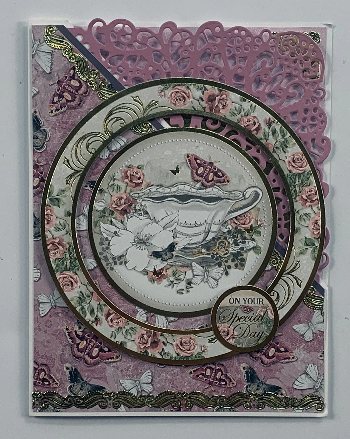 Remove the Everlasting Memories circle teacup topper and its frames, then set aside the inner frame for step 6. Glue the teacup to the center front and foam tape the frame around it, using small foam tape pieces over the lacy die-cut. Glue the “on your special day” sentiment to the frame as shown.