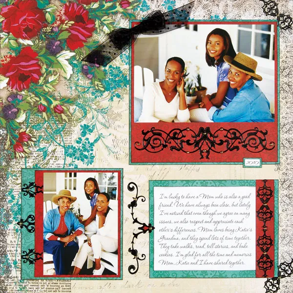 Place your paper so the rose corner is on the top left of the page. Mat a 4”x6” photo with red tapestry paper leaving 1/8” border on 3 sides and a 1 ½” border on the bottom. Ink the edges black and mat again on teal tapestry paper, leaving a ½” border. Ink the edges and glue the mat ¾” from the top of the page and ½” from the right side.
