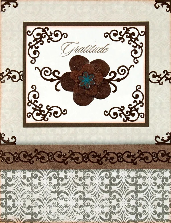 Mat a 3 1/2” x 3” rectangle of white cardstock with brown, leaving a 1/8” wide border. Place corner Dazzles™ in each corner and secure a layered brown flower with a brown flower brad to the center. Place swirl Dazzles™ extending from under the flower on the right and left sides.