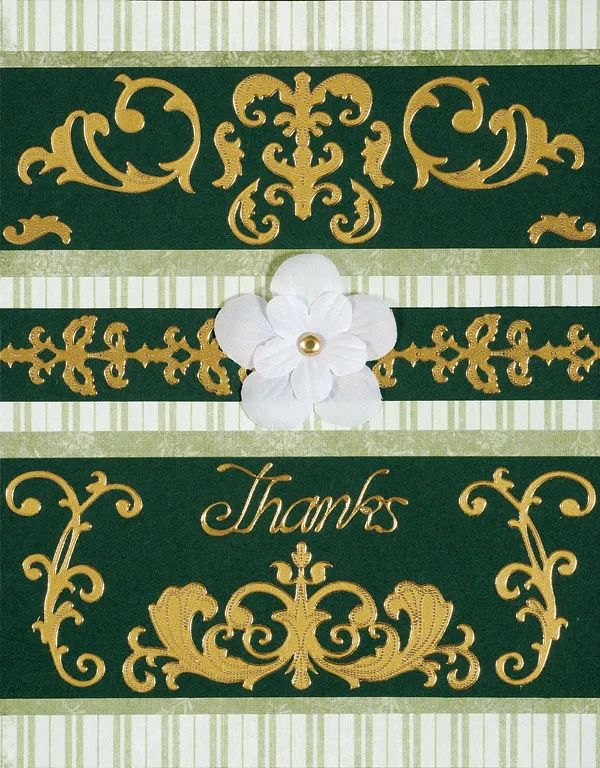 Glue the 5” x ¾” rectangle centered across a 5” x 1 ¼” green/ivory striped rectangle and glue centered across the card front. Glue the remaining cardstock rectangles across the card front as shown.