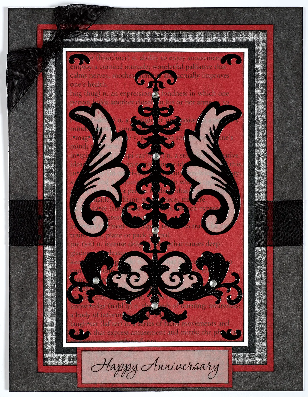 Ink the edges of a 3” x 5” red/black words paper and mat on white cardstock, leaving a 1/16” border. Mat again on onyx glimmer, leaving a 1/8” border. Glue centered to the matted rectangles on the card front.