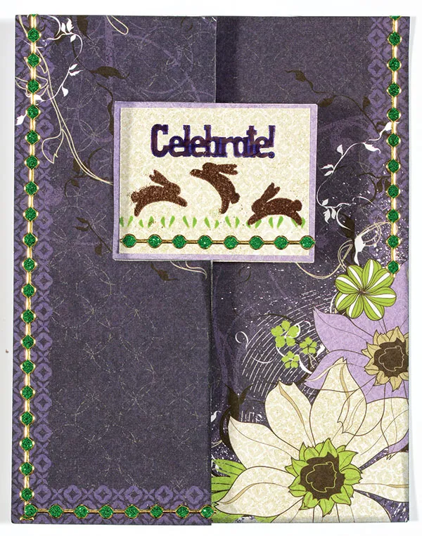 Use Mowed Lawn ink to make grass on a 2 3/8”x1 7/8” Wildflowers beige paper. Use VersaMark ink to make three bunnies on the grass. Dust with Chestnut Embossing Powder. Tap off the excess. Heat with the heat tool. Mat on Wildflowers purple paper, and glue to the rectangle.