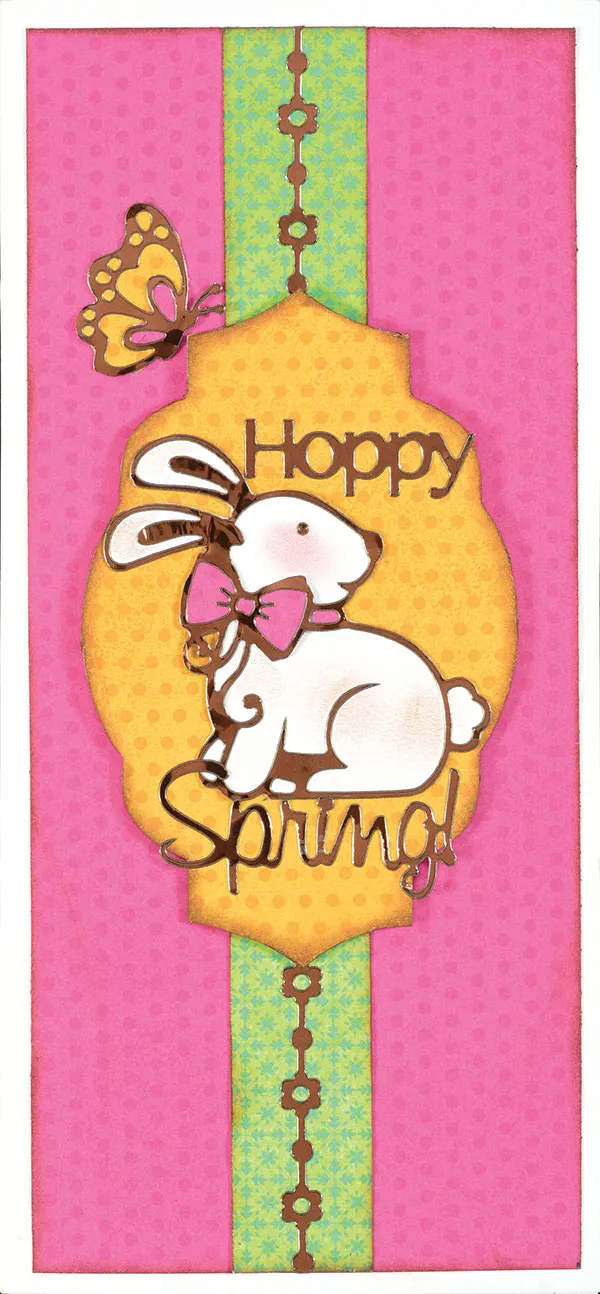 Inside: Cover the back inside tunnel card panel with green paper. Back the tall bunny Dazzles™ with pink paper for the bow and the body with white cardstock. Cut out just under the outside edge of the sticker. Apply pink chalk to the bunny cheek and brown to the ears and body. Glue the bunny to the center fold on the green card panel so that it will be centered in the window. Back the carrot Dazzles™ with yellow paper and foam tape to the bunny as shown. Fold the green panel to make a fold in the bunny body.