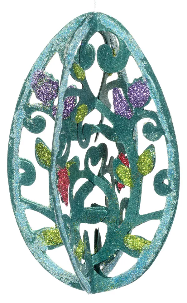 On one egg, place Dazzles™ as shown. On the other egg, choose random areas to apply glue, then glitter. Only do one color of glitter at a time. Place glue on 1-3 leaves on one half, then pour glitter. Then go to the next half, and place glue, and pour glitter. Keep repeating this all around the egg. Then start with the next color and do the same thing.