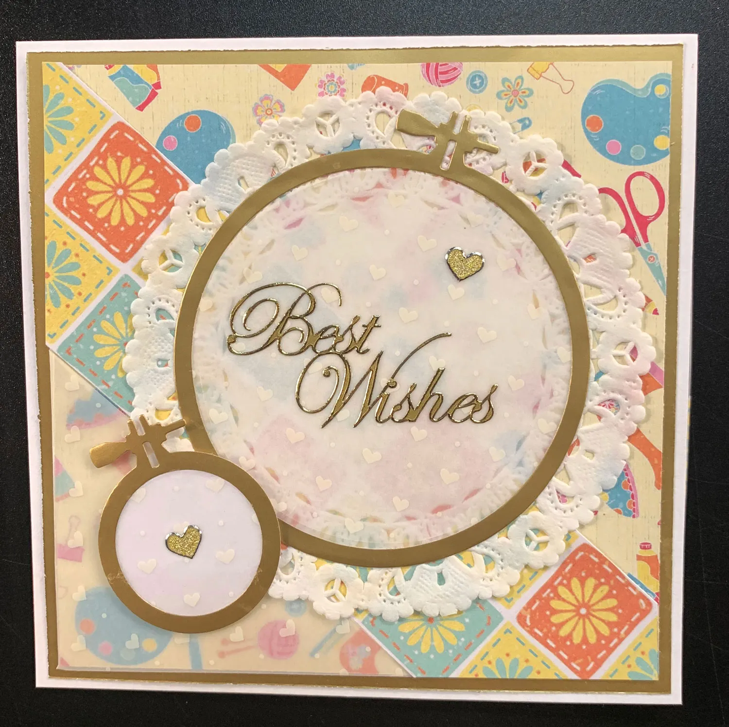 Using a die cutting machine cut out all the hoop dies out of the gold paper and set aside. Glue a doily a little off center to the right. Glue the vellum to the backs of all three hoops and trim to fit. Also glue a piece of white paper (I used the back side of one of the papers being used) behind the vellum on the smallest hoop. Angle the largest hoop slightly and glue to the center of the hoop. Add Dazzles™ greeting to the center of this hoop. Glue the smallest hoop to the left and below the large one and place a gold heart Dazzles™ in the center.