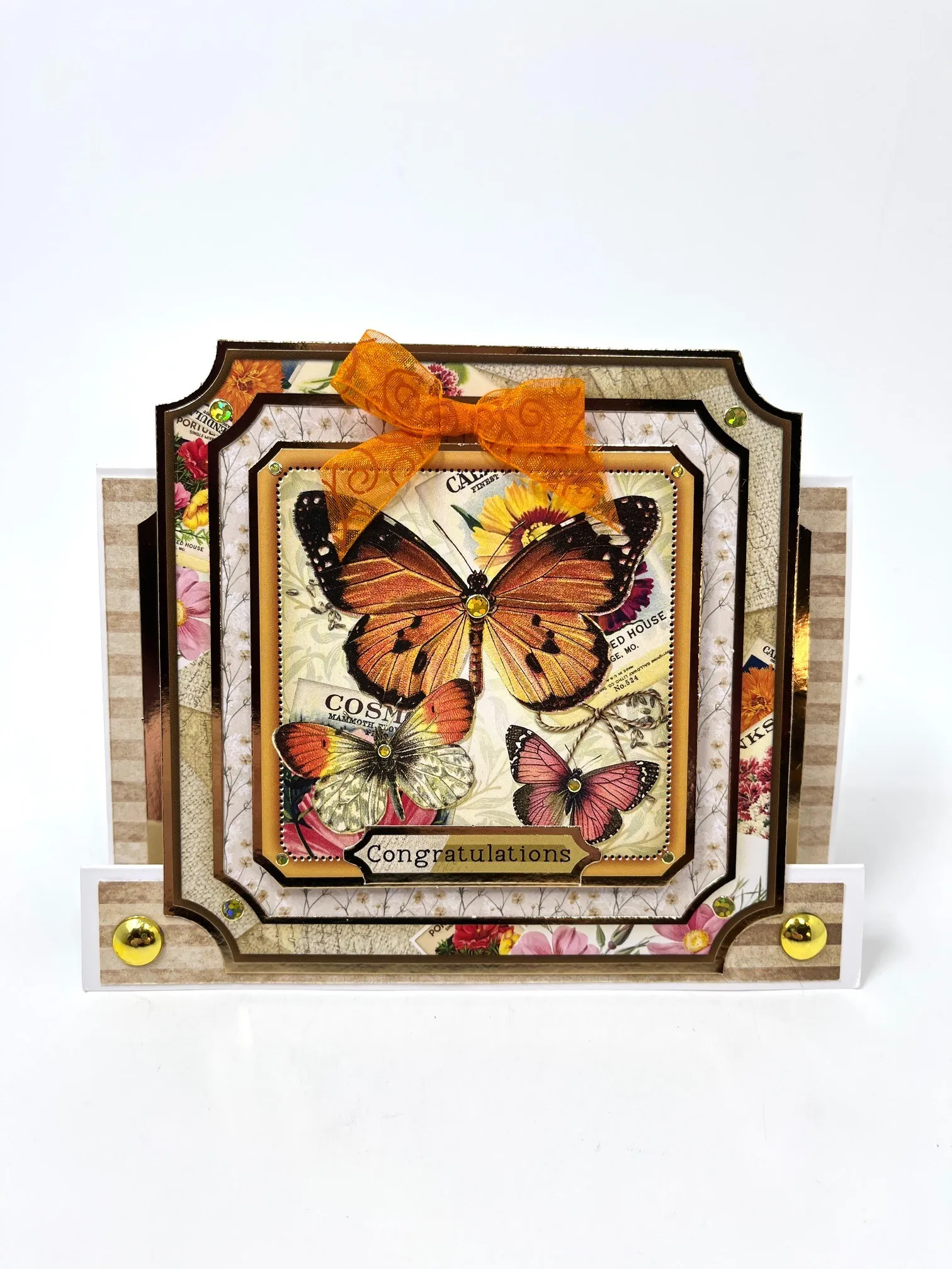 Add a double layer of foam tape to the center butterfly Topper and attach to the card. Make and Zot™️ a 2” wide bow from the Orange & Peach Ribbon Set then place at the top of butterfly Topper. Tape “Congratulations” at the bottom of the butterfly Topper. Place large gold studs at the bottom. Place gold jewel Dazzles™️ on the butterflies and corners of the large frame.