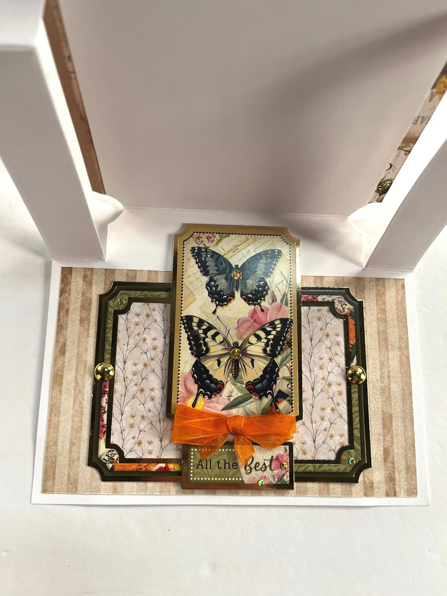 Card inside: Cut a 6”x3 3/4” stripes patterned cardstock (with stripes going vertically) and tape to base leaving 1/8” white borders. Select butterfly Topper and separate out the frames. Tape sprig patterned paper behind the outer frame and trim to fit. Tape 3/4” from right and left sides and 1/4” from the bottom. Foam tape “All the Best” centered on the bottom of the frame. Foam tape center of Topper above it 1/4” from the fold. Make and Zot™️ a 2” wide bow from the Orange & Peach Ribbon Set between them. Place two studs on the frame and gold jewel Dazzles™️ on butterflies, frame, and Topper sentiment.
